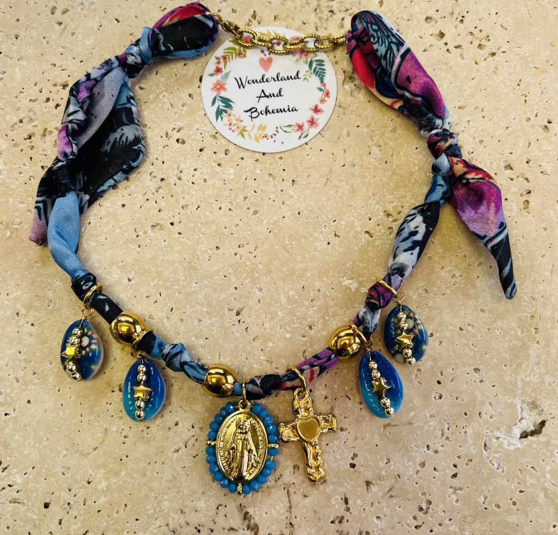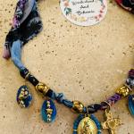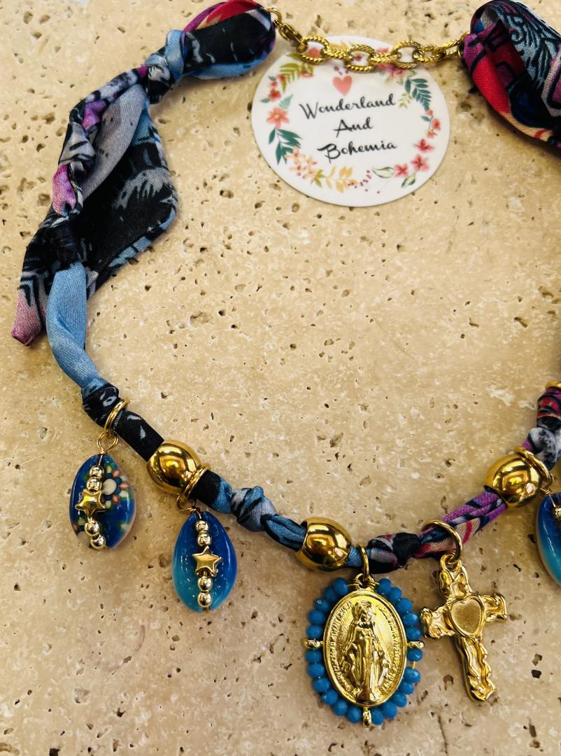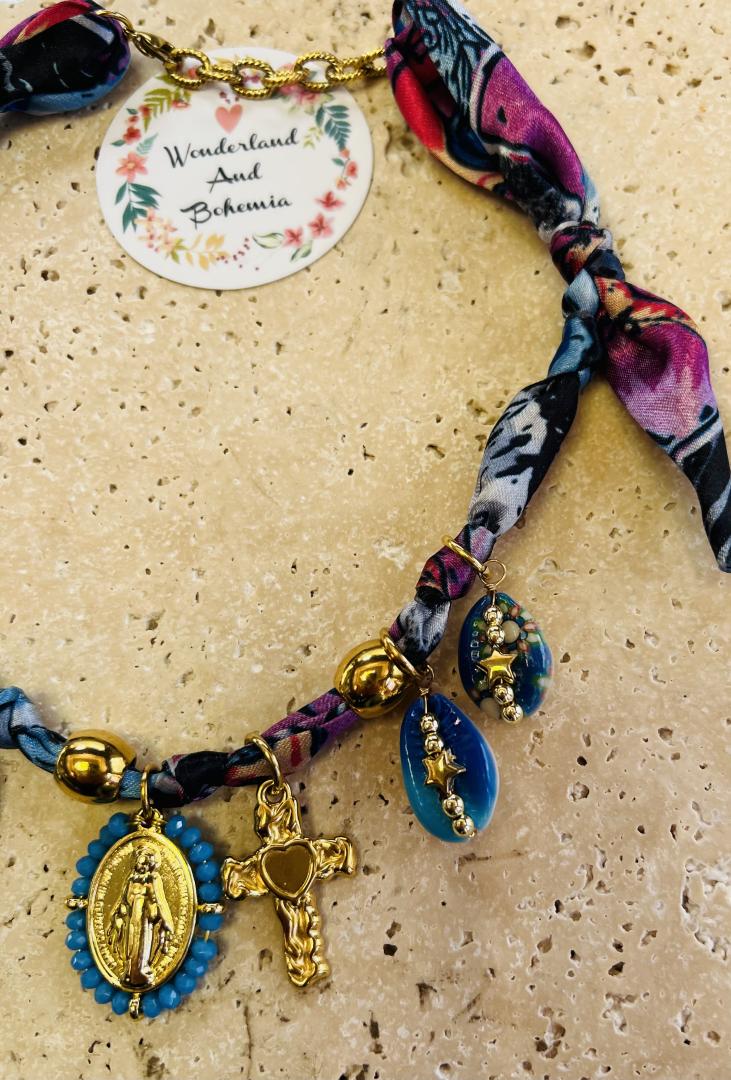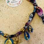 Ce collier original marie la douceur du tissu noué façon foulard à la force symbolique de breloques dorées sacrées : cœur sacré, croix, ange protecteur, médailles spirituelles.