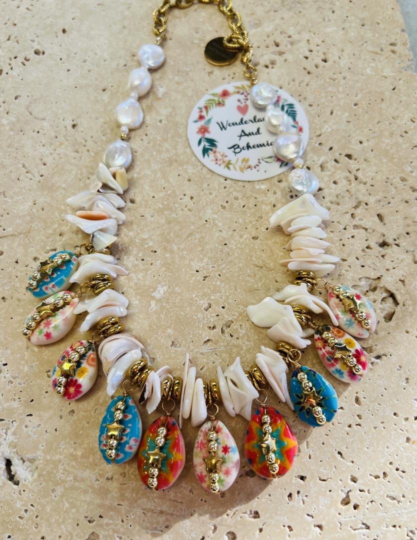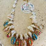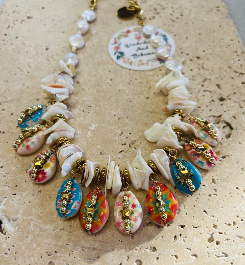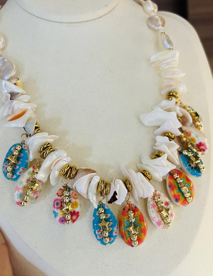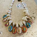 Composé de perles de nacres naturelles, de fragments nacrés et de coquillages dorés et coloré , il capture l’essence même de l’exotisme et du raffinement.
