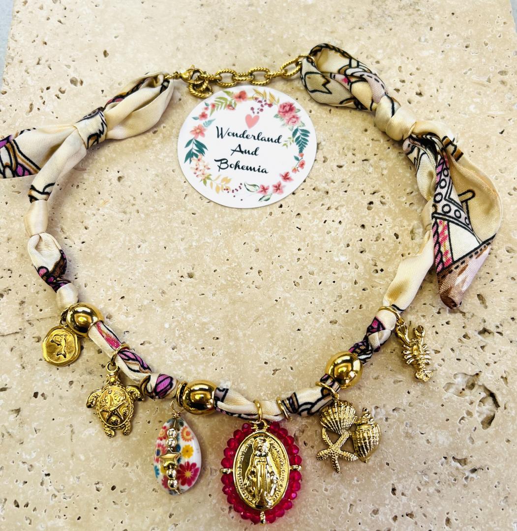 Collier foulard bohème fait main – Breloques dorées sacrées & tissu noué – Bijou unique style baroque et méditerranéen