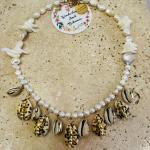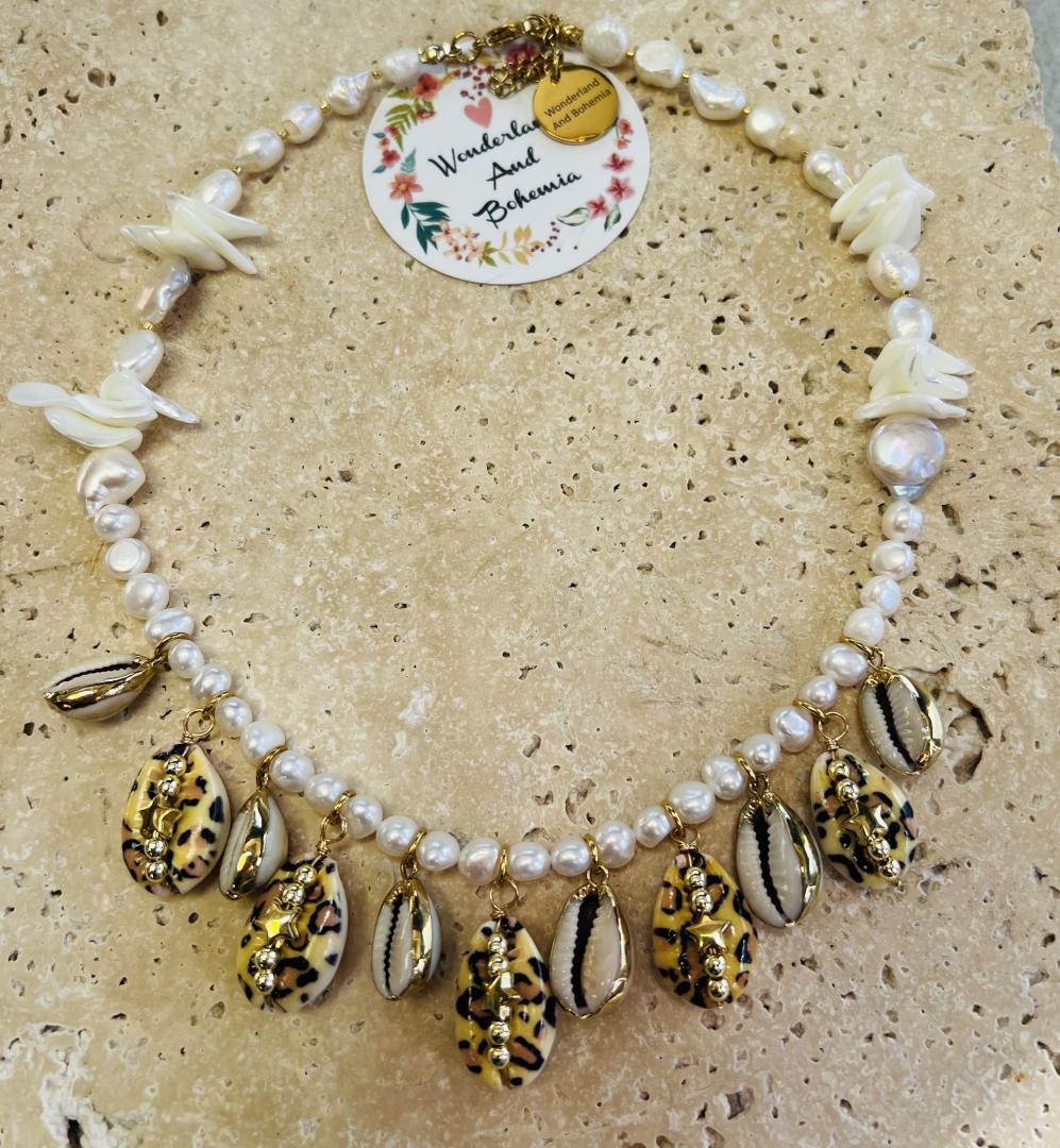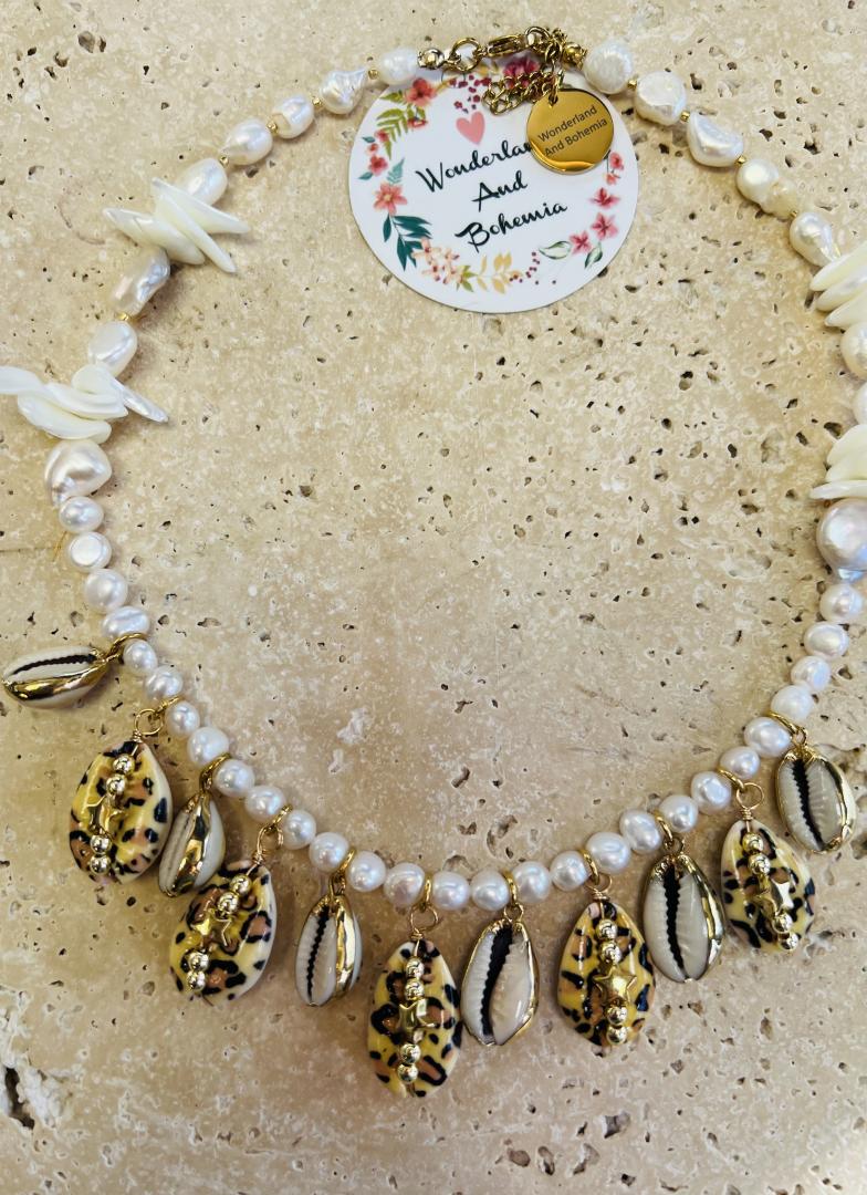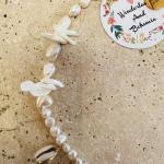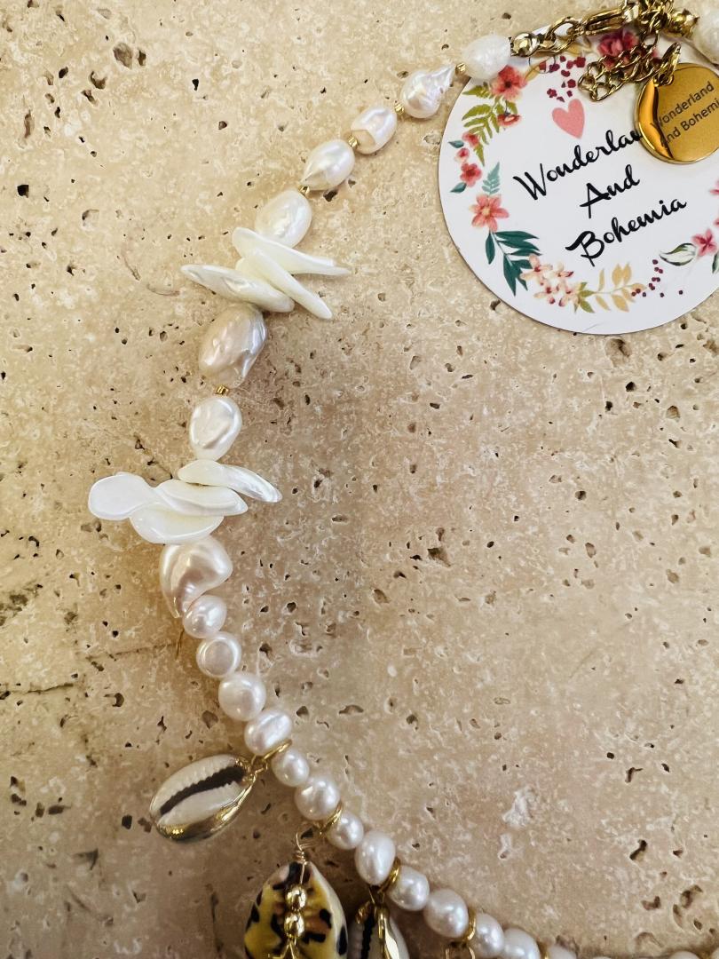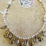 Composé de perles d’eau douce naturelles, de fragments nacrés et de coquillages dorés et tachetés, il capture l’essence même de l’exotisme et du raffinement.