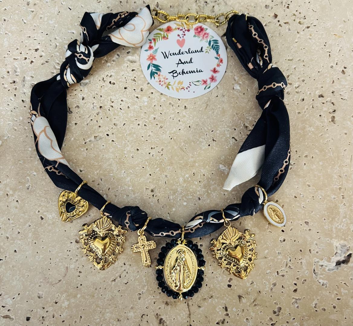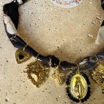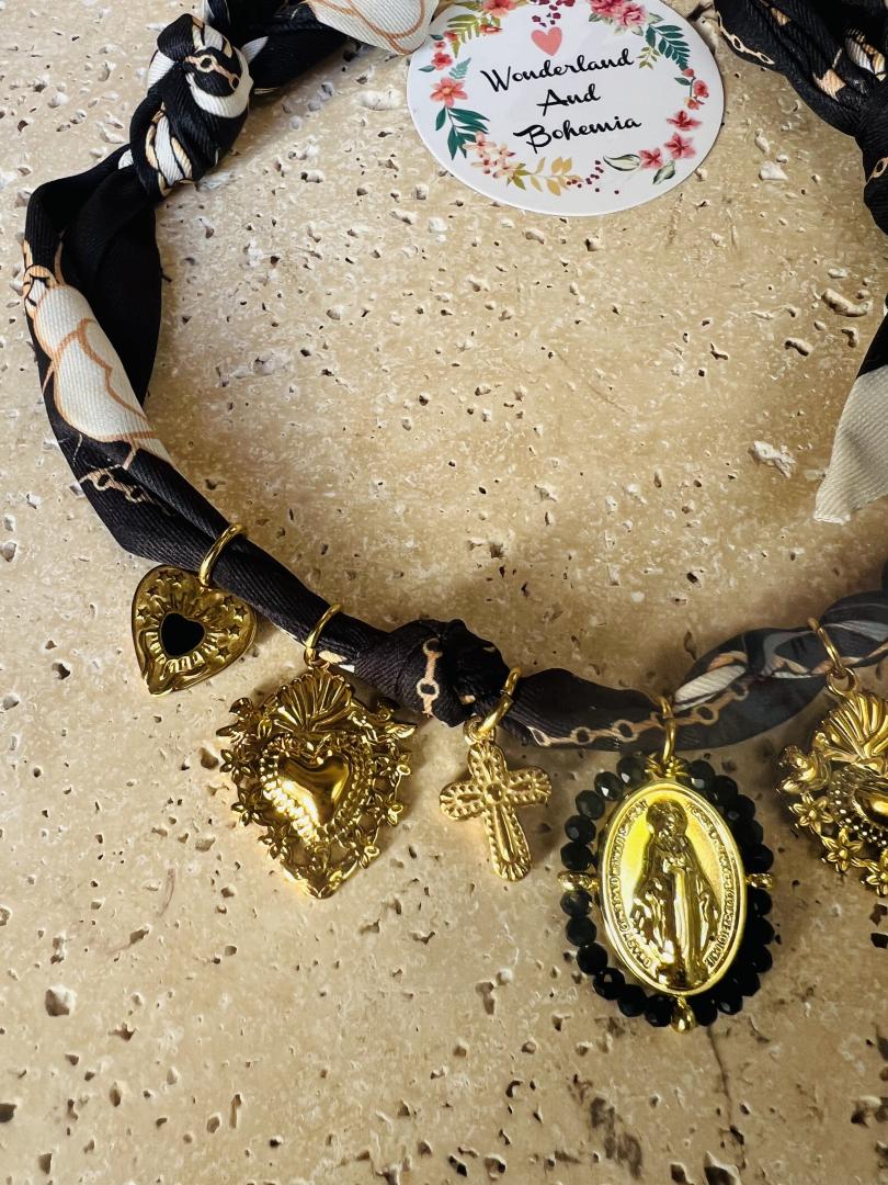 Ce collier original marie la douceur du tissu noué façon foulard à la force symbolique de breloques dorées sacrées : cœur sacré, croix, ange protecteur, médailles spirituelles.