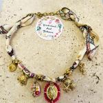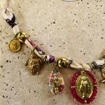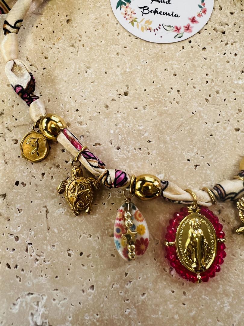 Ce collier original marie la douceur du tissu noué façon foulard à la force symbolique de breloques dorées sacrées : protecteur, médailles spirituelles.