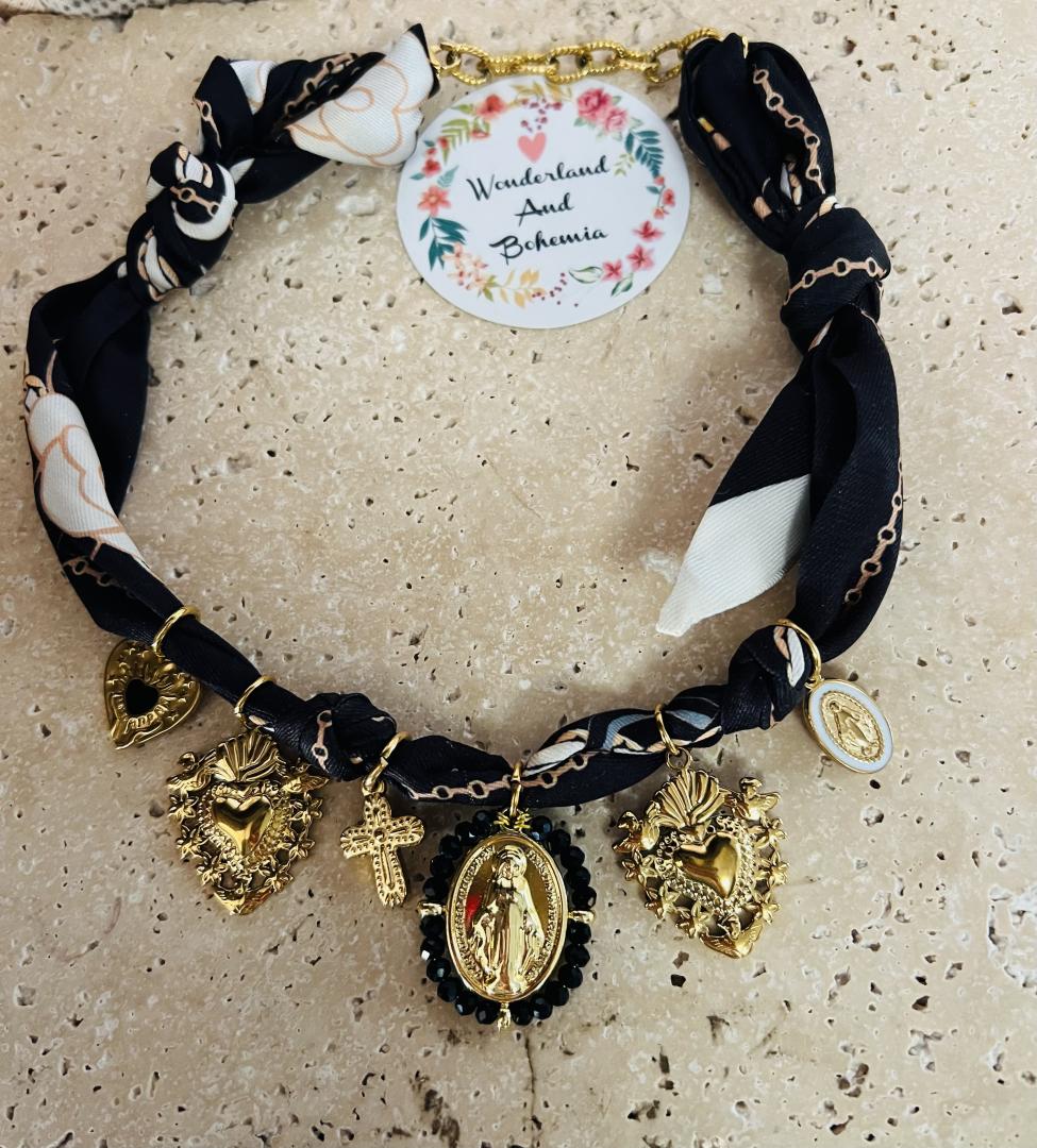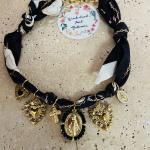 Ce collier original marie la douceur du tissu noué façon foulard à la force symbolique de breloques dorées sacrées : cœur sacré, croix, ange protecteur, médailles spirituelles.